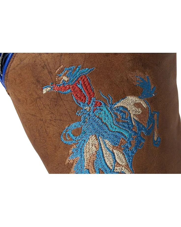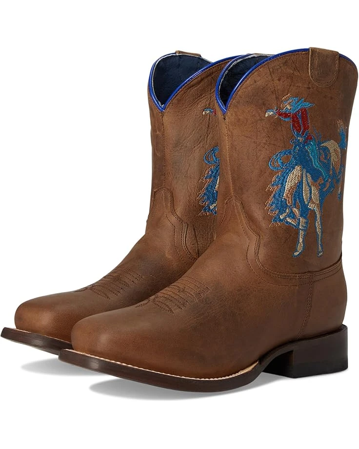 - Kick up some dust in style – saddle up wearing the Roper® Kids Buckin Bronc 2! Crafted from premium vintage brown leather, these boots feature a stunning embroidered horse rider design on the shaft, letting little cowboys and cowgirls show off their adventurous spirit. The square toe and calf-high cut offer a classic Western look, while the pull-on design ensures easy wear for any trailblazing kid. Built for comfort and durability, these boots boast a rubber insole, leather lining, and a sturdy double ¾ welt sole with nails. A reliable block heel gives stability and support, making them perfect for all-day play or riding.
