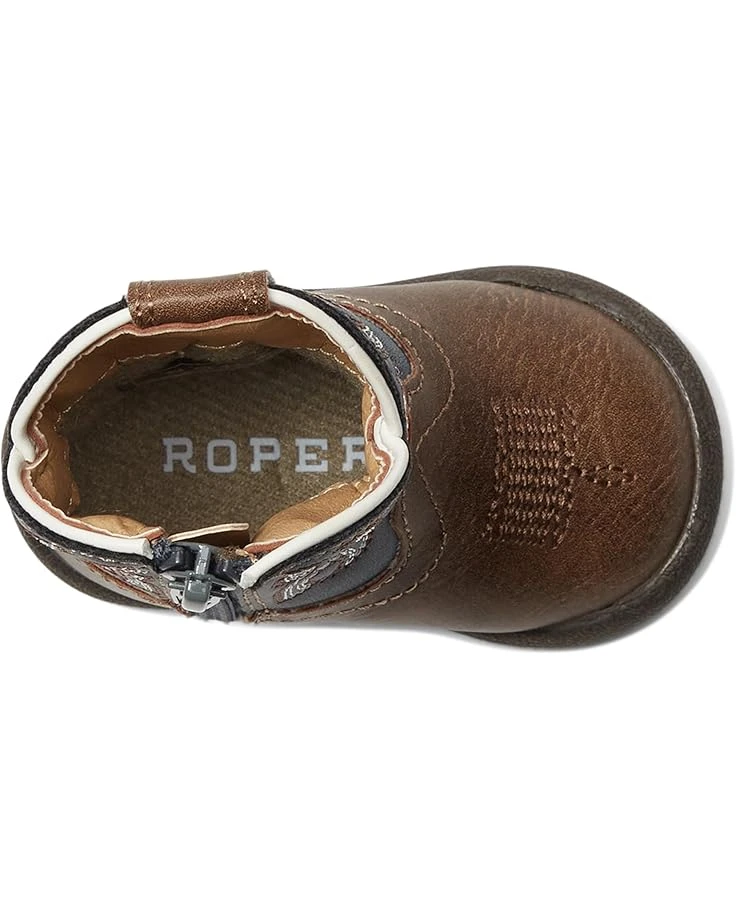 - Your child will be the star of the rodeo wearing the Roperยฎ Kids Cowbabies Ainsley boots! Made with synthetic upper and classic Western stitch design on the shaft, these mid-calf boots are perfect for any young cowboy or cowgirl. The round toe design and overlay mule ear pull give these boots an authentic Western feel, while the nylon lining and rubber insole ensure all-day comfort.