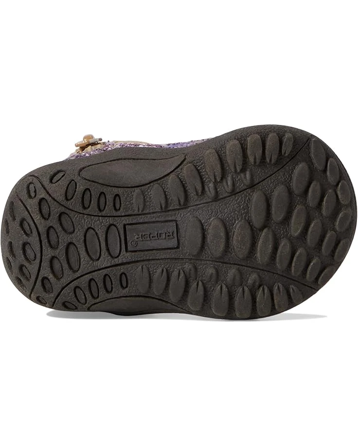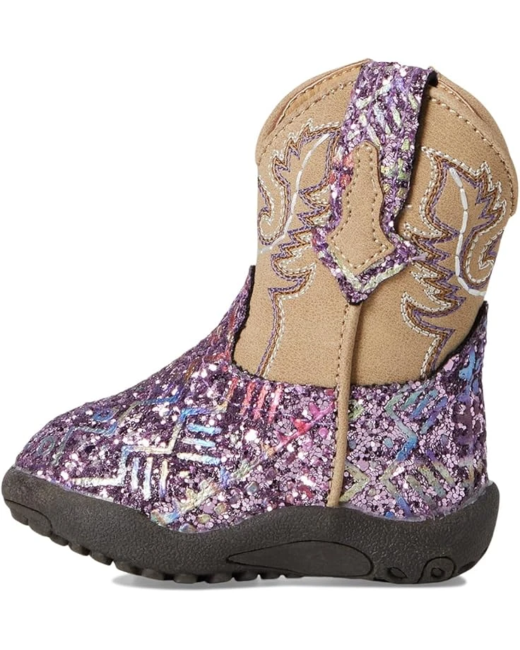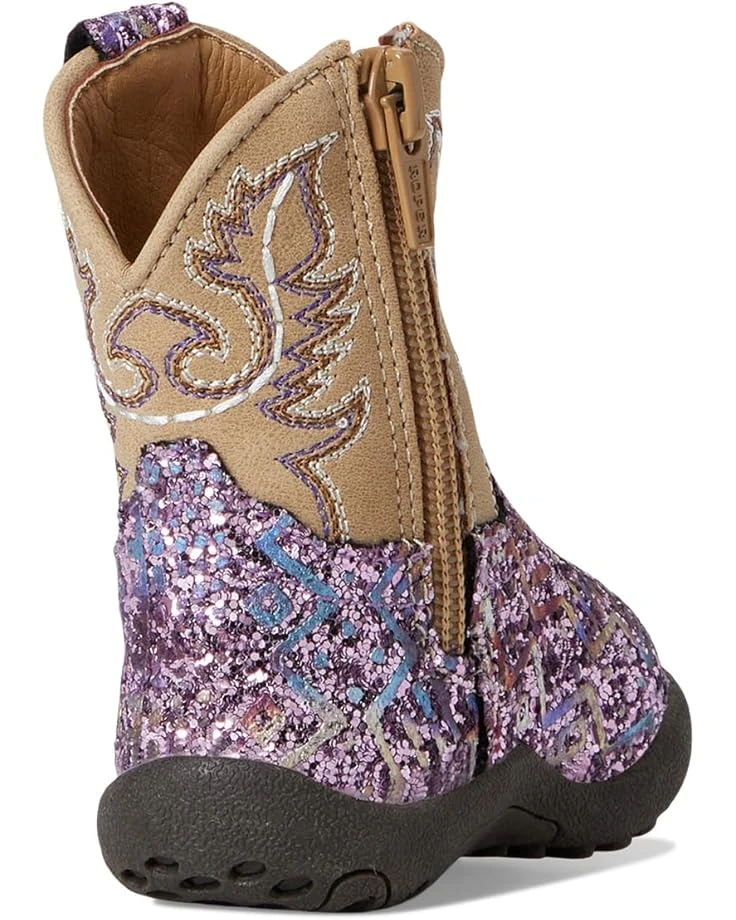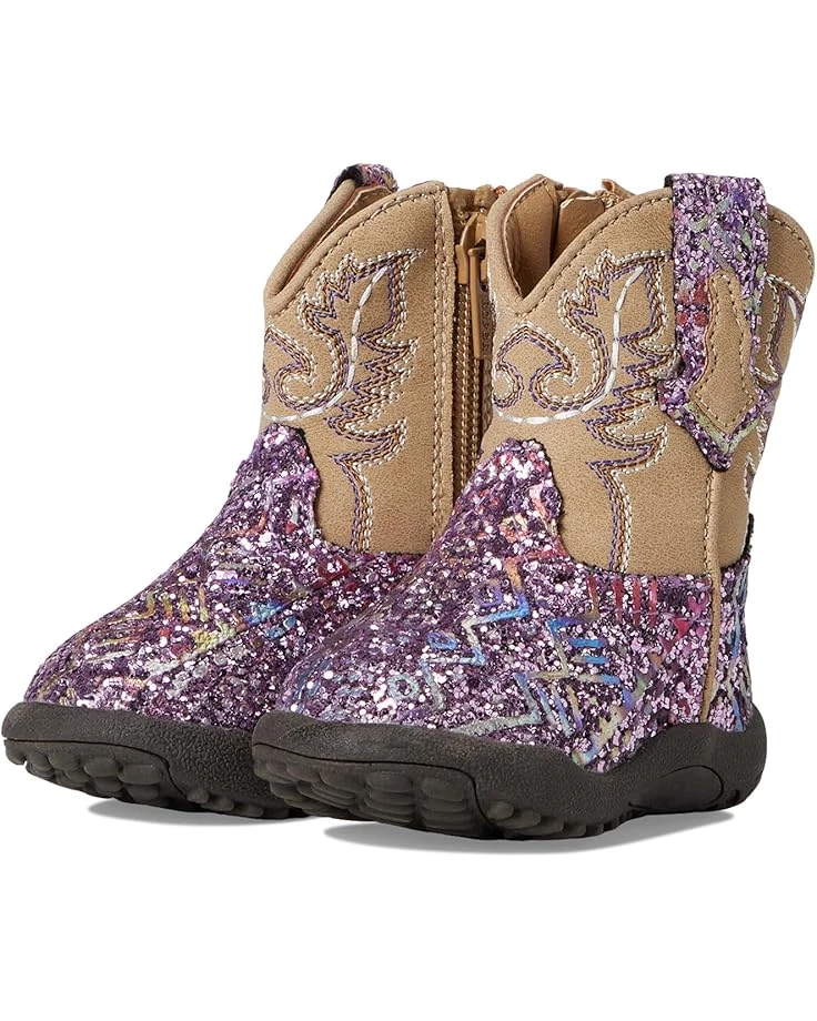 - Designed with a zippered side closure for easy on and off, the Roperยฎ Kids Cowbabies Glitter Aztec boots are perfect to add an eye-catching twist to your kid’s outfits. The synthetic upper of these mid-calf boots features a western stitch, glitter detail allover, and side pull handles. The rubber insole and nylon lining offer all-day comfort.