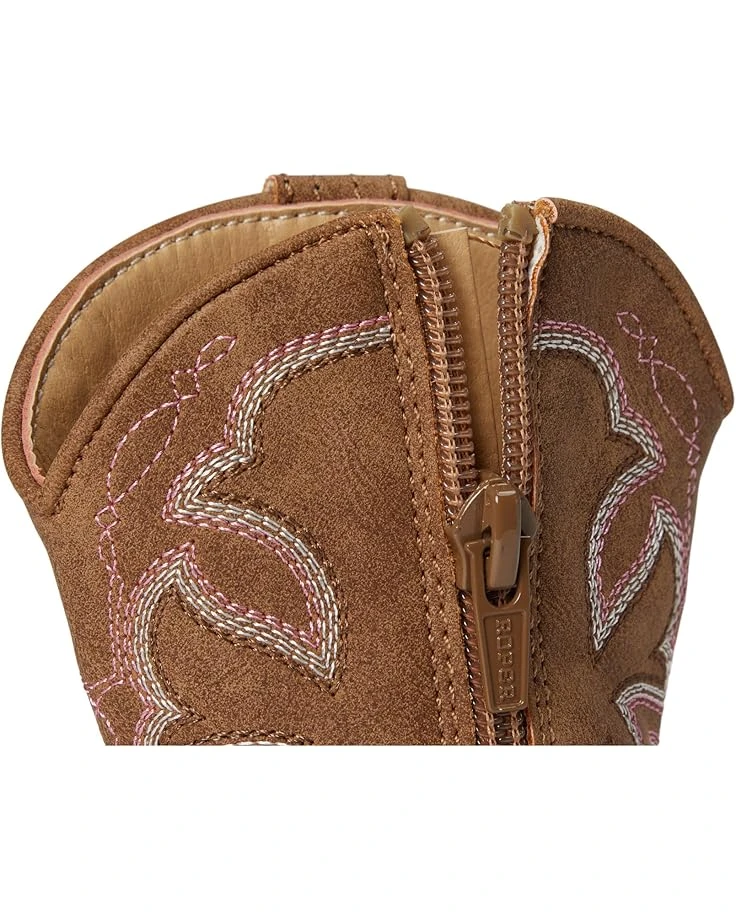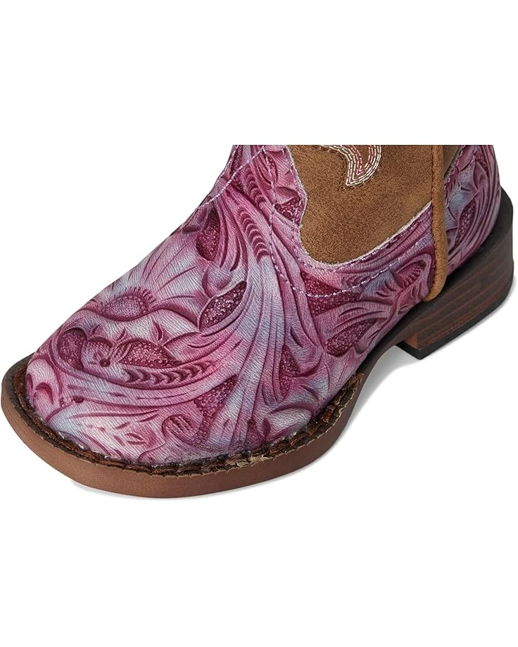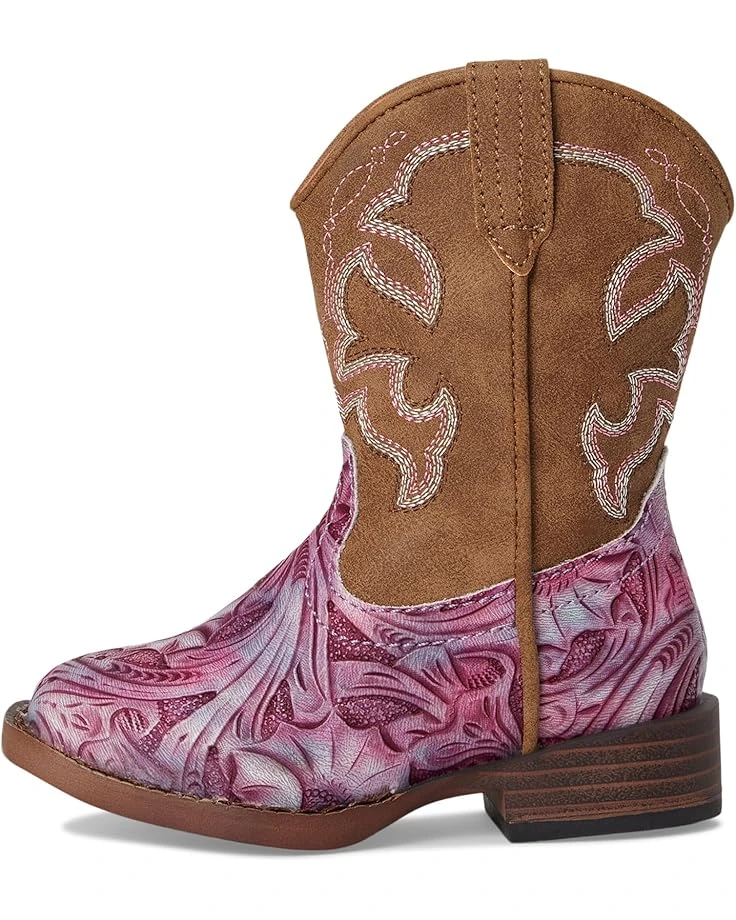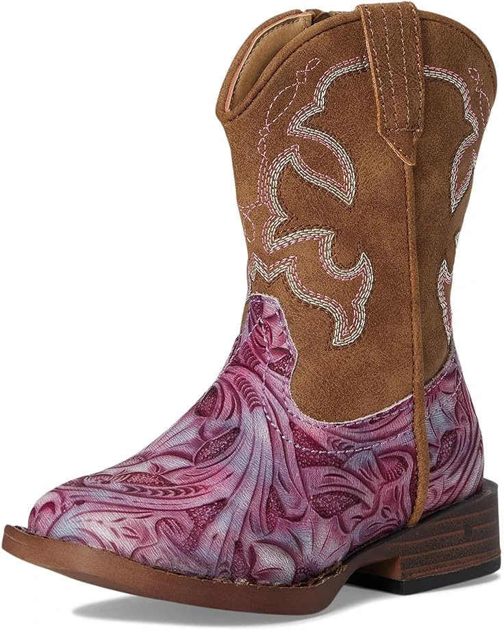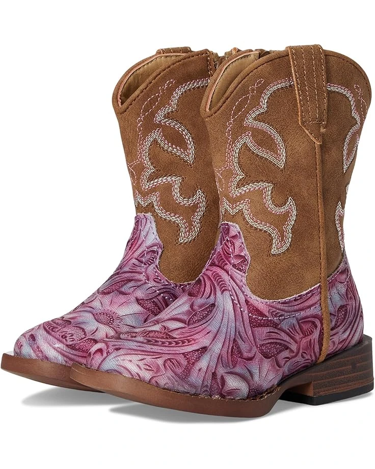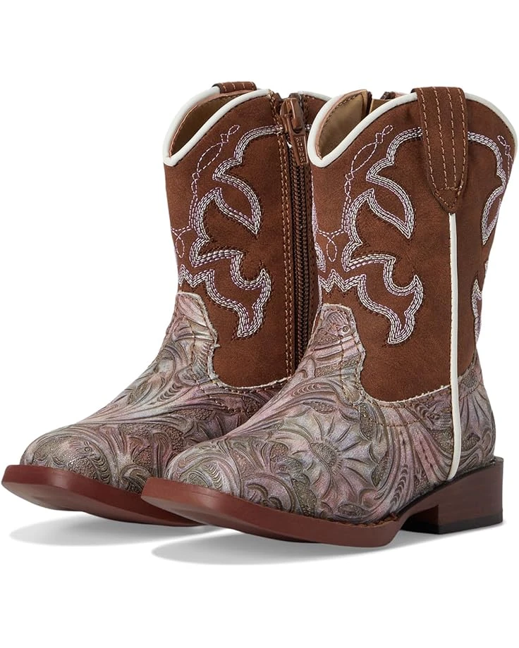 - Let your little ones embrace adventure with a modern twist on classic Western flair wearing Roperยฎ Kids Raya, the perfect blend of style and comfort! These mid-calf boots feature a floral embossed faux leather vamp, adding a whimsical touch to the classic Western stitch design on the shaft. The pull-on style with overlay mule ear pulls makes them easy for little ones to wear. Built with a durable synthetic upper, nylon lining, and a flexible TPU outsole for all-day play, the square toe and rubber insole offer extra comfort and support.